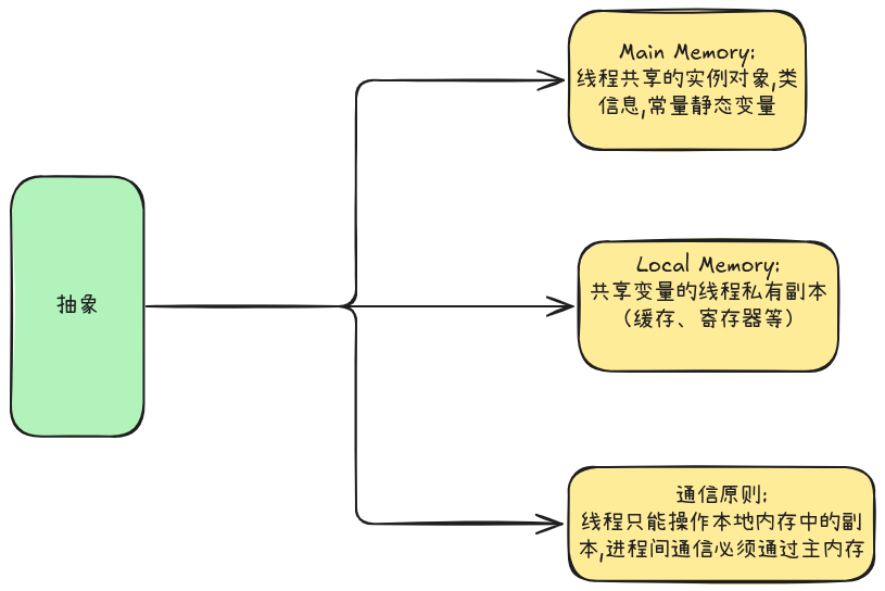 - 本地内存:每个线程私有的区域,是 JMM 的一个抽象概念。它存储了该线程对主内存变量的副本。