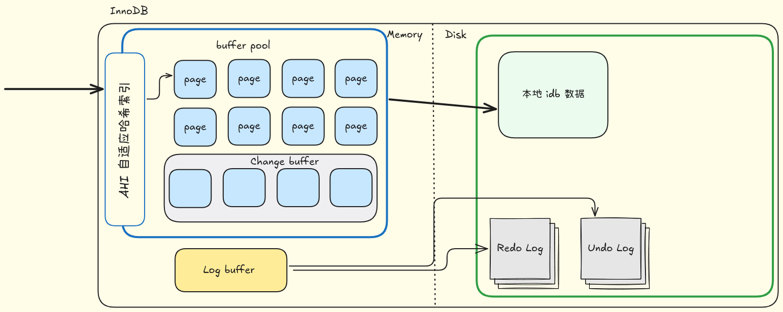 当 SQL 命令进入存储引擎后 存储引擎会 首先 尝试 AHI 如果命中不查页哈希表 否则进入 页哈希表查看当前 记录所在页是否存在 buffer pool 中 不存在则从本地硬盘读取所在页进入buffer pool
