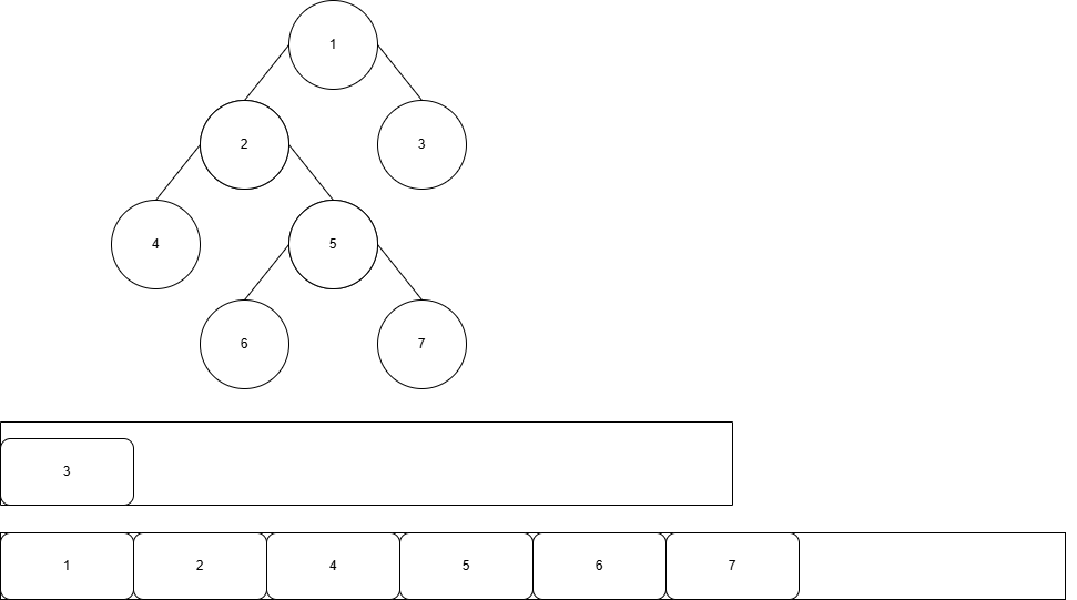 因为是前序遍历,所以我们可以在装入stack后立即弹出加入res数组,接着将 右 左 ,装入stack,这时我们就需要将 左 看作完整树,那么重复上述步骤,弹出元素,将这个节点的 右 左 装入stack。